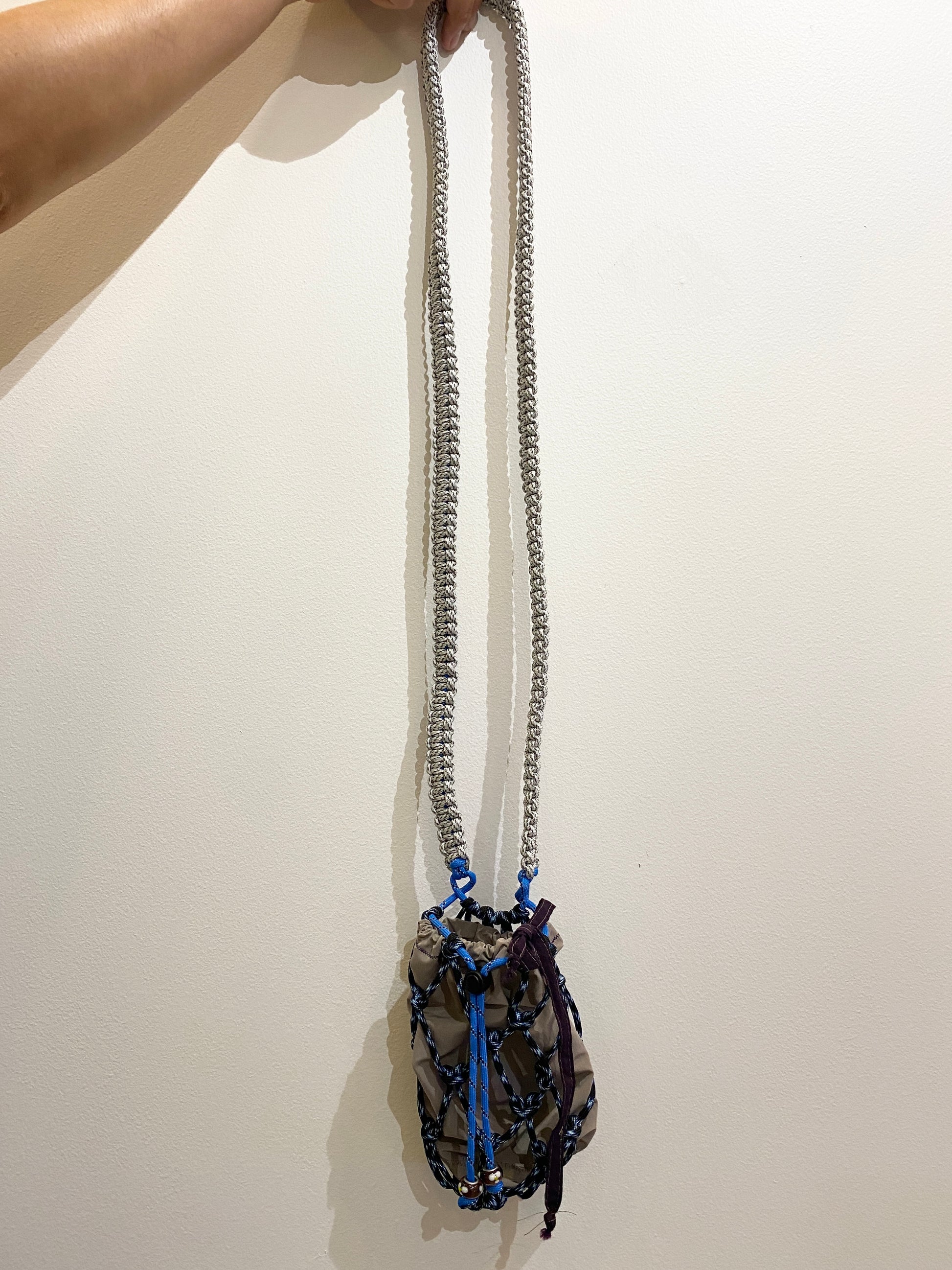 The artist has created a collection of bags for Treasure. Using water bottles as a mould, each bag was hand-knotted by the artist using 550 paracord. The colour combinations are inspired by nature, urban sceneries and Amihan’s favourite shades. The artist also drew inspiration from Ming Ranginui’s ‘Battle Royale’ for one of the bags in the collection. She has sewn pouches using dead-stock fabrics, which can be used as an inner lining for the bags to keep the wearer’s little trinkets safe. Amihan has a fascination with vessels and the many ways they can be presented, used and formed.
