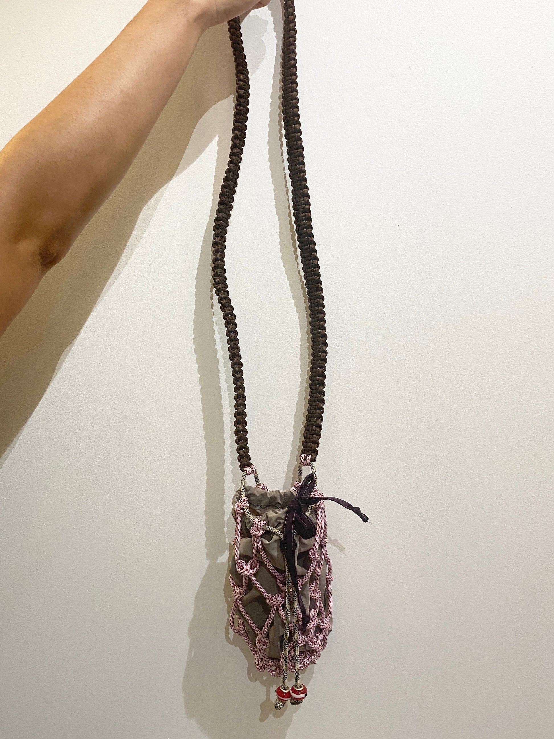Paracord, plastic toggle, glass beads, deadstock polyester