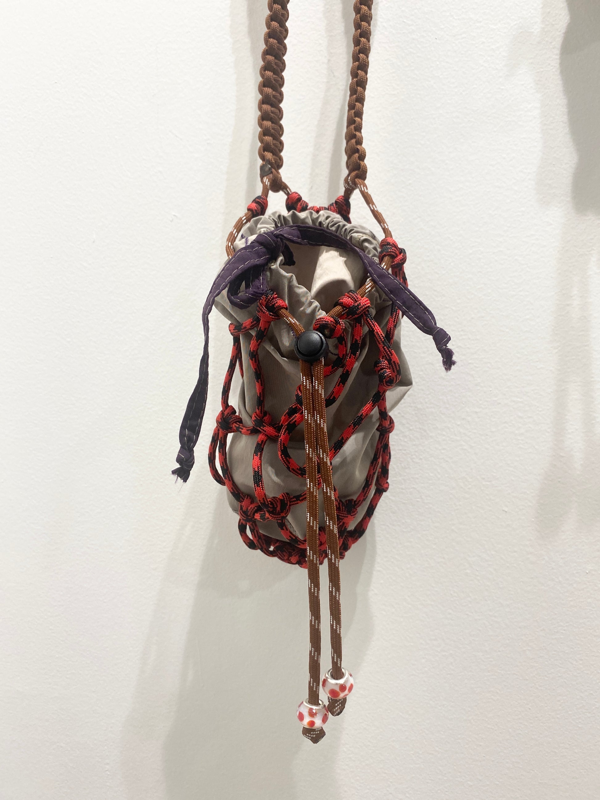 The artist has created a collection of bags for Treasure. Using water bottles as a mould, each bag was hand-knotted by the artist using 550 paracord. The colour combinations are inspired by nature, urban sceneries and Amihan’s favourite shades. The artist also drew inspiration from Ming Ranginui’s ‘Battle Royale’ for one of the bags in the collection. She has sewn pouches using dead-stock fabrics, which can be used as an inner lining for the bags to keep the wearer’s little trinkets safe. Amihan has a fascination with vessels and the many ways they can be presented, used and formed.