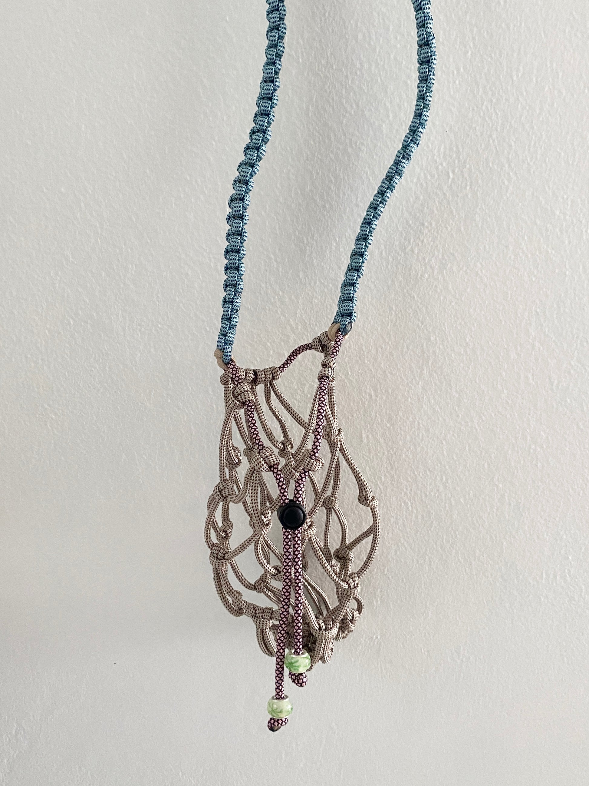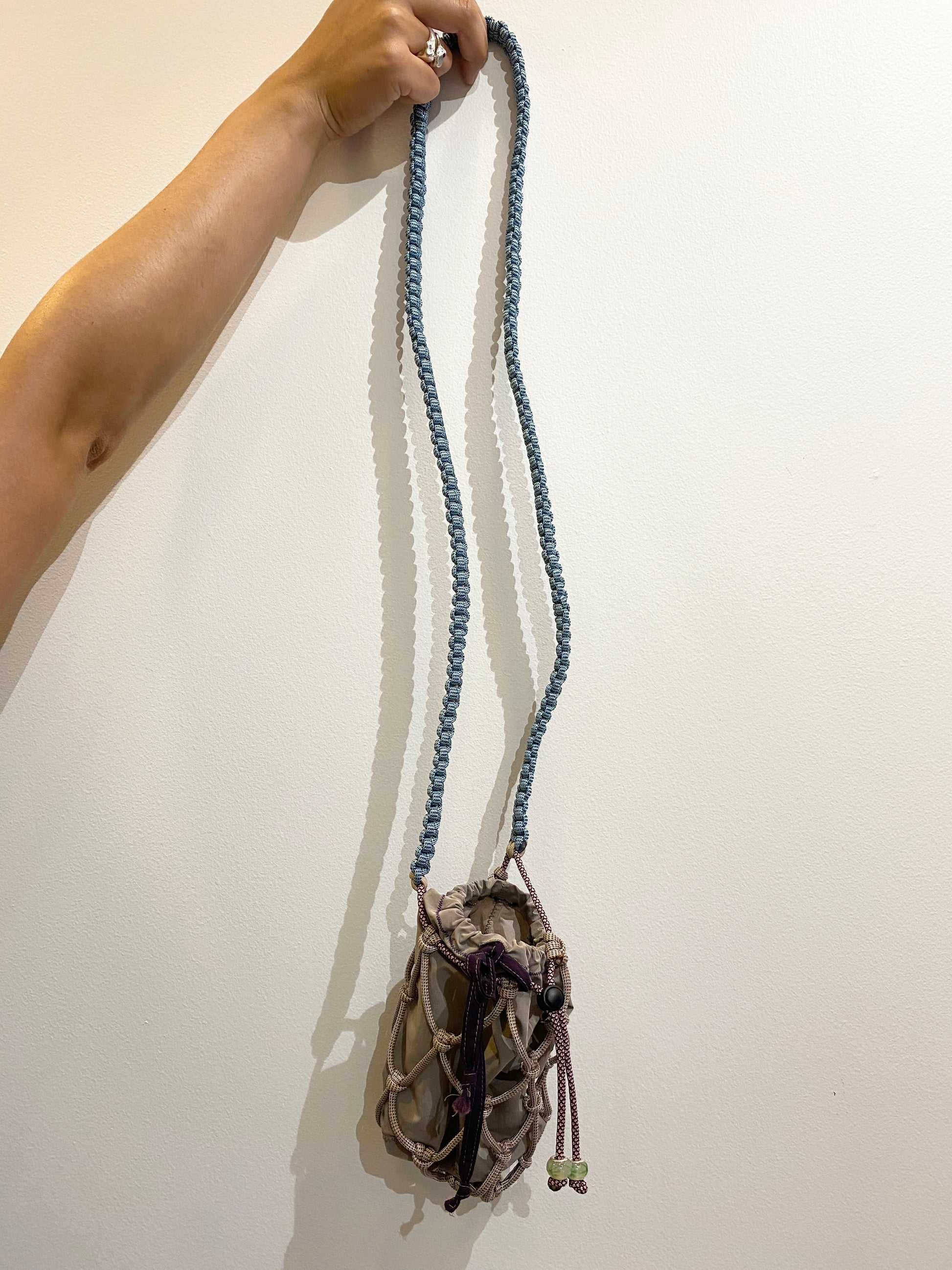 The artist has created a collection of bags for Treasure. Using water bottles as a mould, each bag was hand-knotted by the artist using 550 paracord. The colour combinations are inspired by nature, urban sceneries and Amihan’s favourite shades. The artist also drew inspiration from Ming Ranginui’s ‘Battle Royale’ for one of the bags in the collection. She has sewn pouches using dead-stock fabrics, which can be used as an inner lining for the bags to keep the wearer’s little trinkets safe. Amihan has a fascination with vessels and the many ways they can be presented, used and formed.
