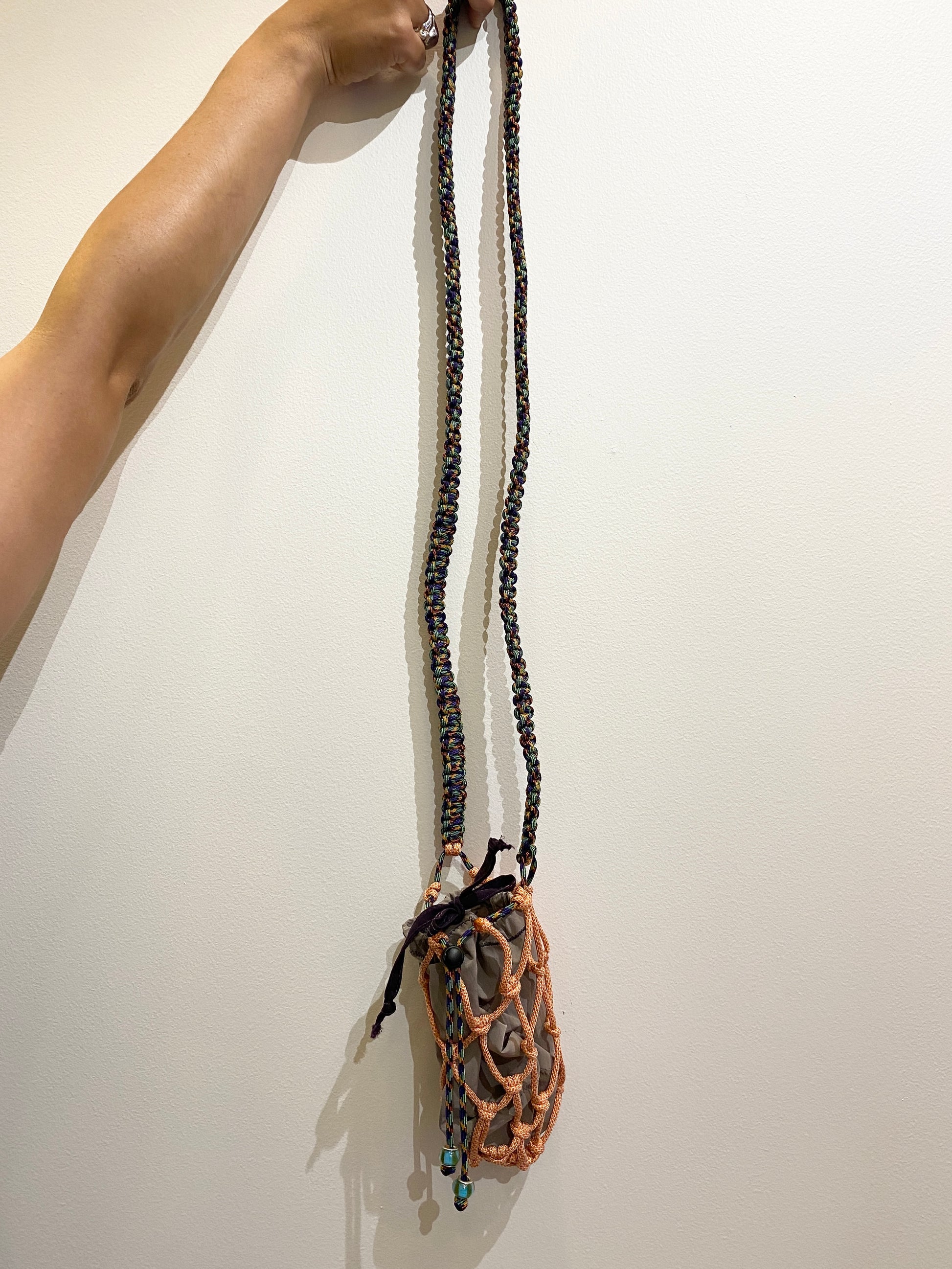 The artist has created a collection of bags for Treasure. Using water bottles as a mould, each bag was hand-knotted by the artist using 550 paracord. The colour combinations are inspired by nature, urban sceneries and Amihan’s favourite shades. The artist also drew inspiration from Ming Ranginui’s ‘Battle Royale’ for one of the bags in the collection. She has sewn pouches using dead-stock fabrics, which can be used as an inner lining for the bags to keep the wearer’s little trinkets safe. Amihan has a fascination with vessels and the many ways they can be presented, used and formed.