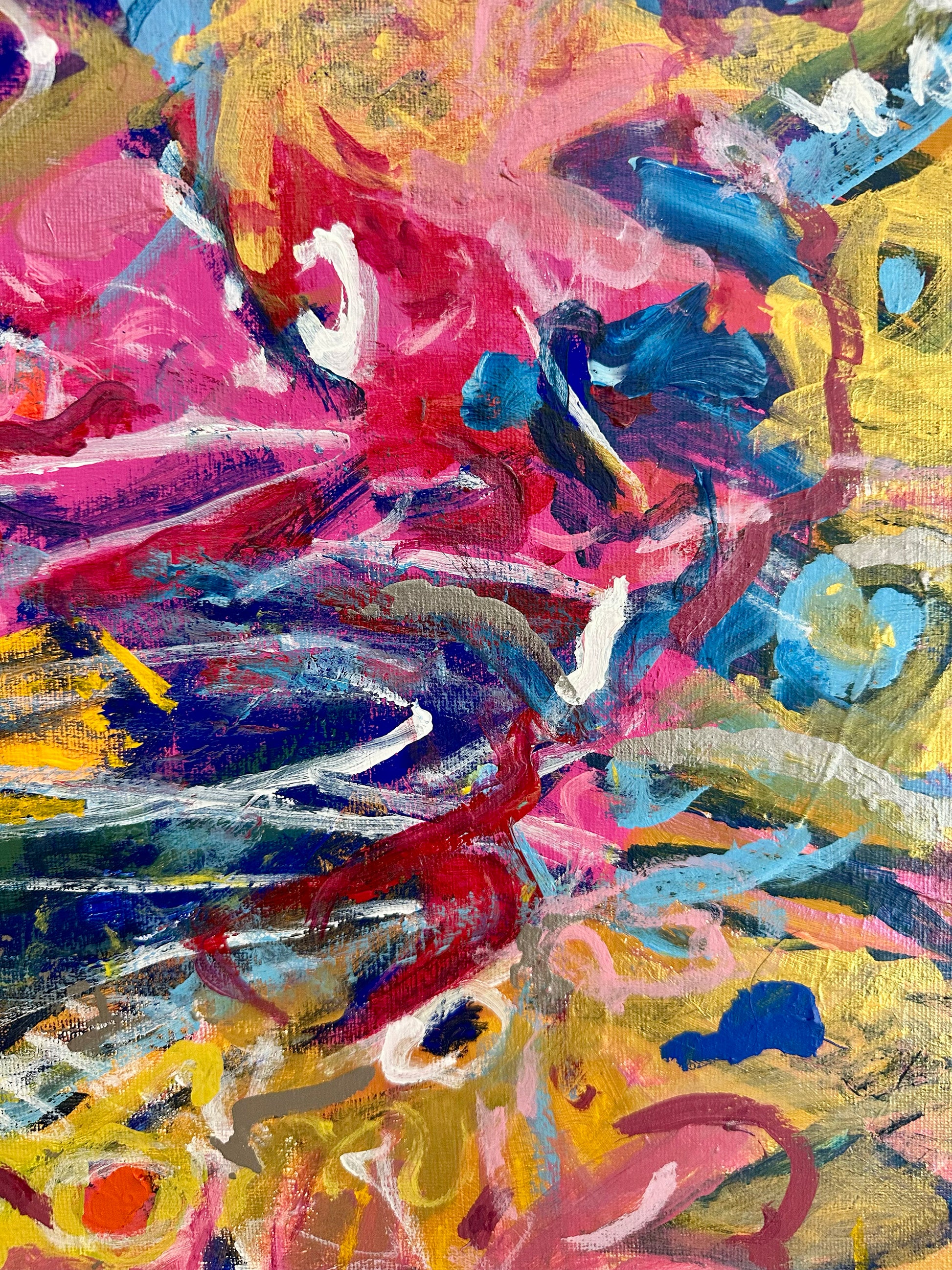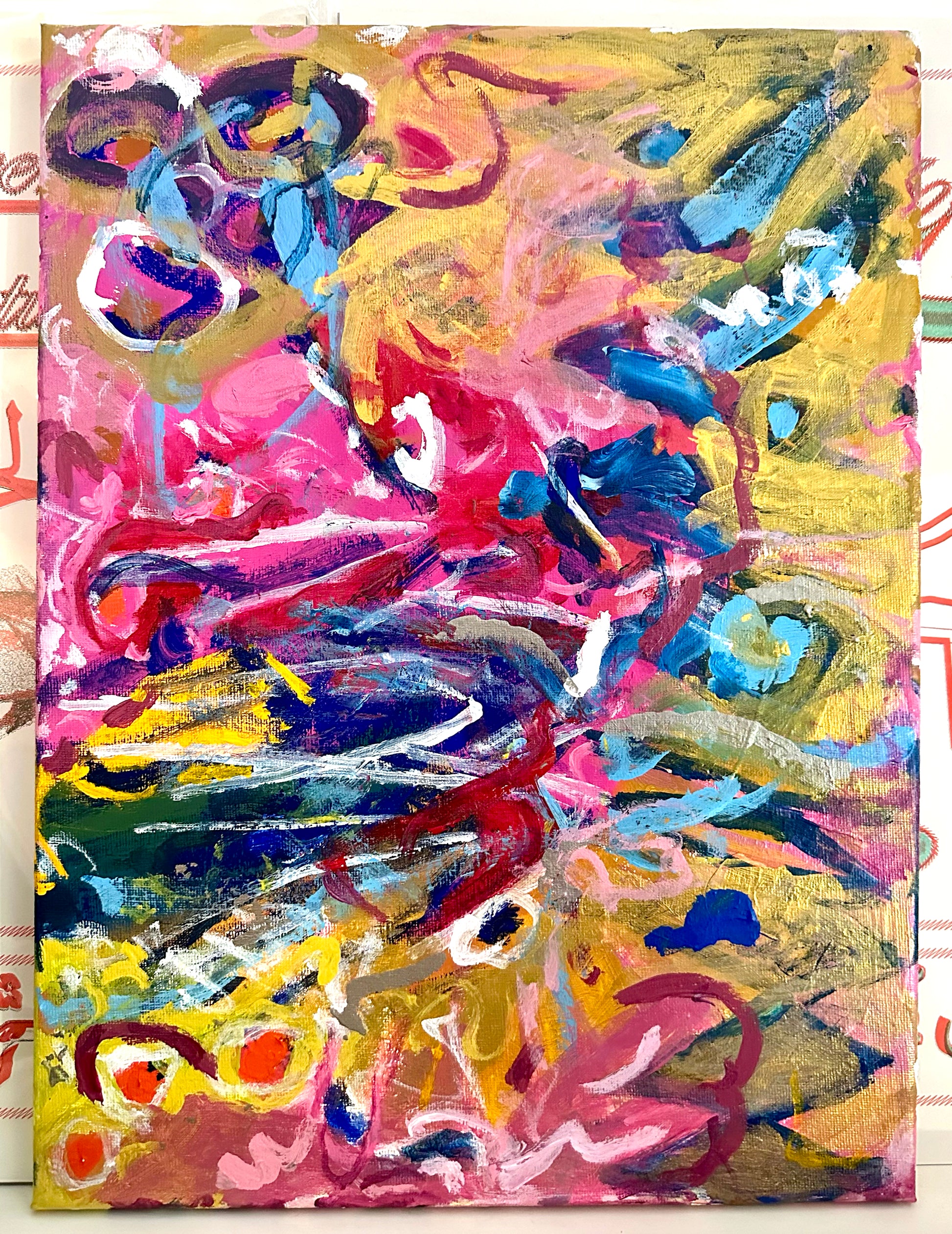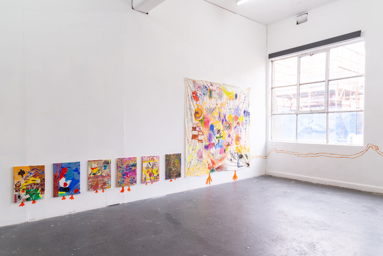 This painting is from the exhibition You Can Use My Phone. This exhibition, both new and familiar, is an offering of depictions that rise from the shared voice of Aunty Jemi Gale, Sol Fernandez and her children and collaborators Blu and Zeia Fernandez Nitor-Zammataro. Here, paintings are not just seen; they are felt — reaching out to little hands. Intended to be felt by the crawling, toddling, wide-eyed, and those who care for and live amongst the young.