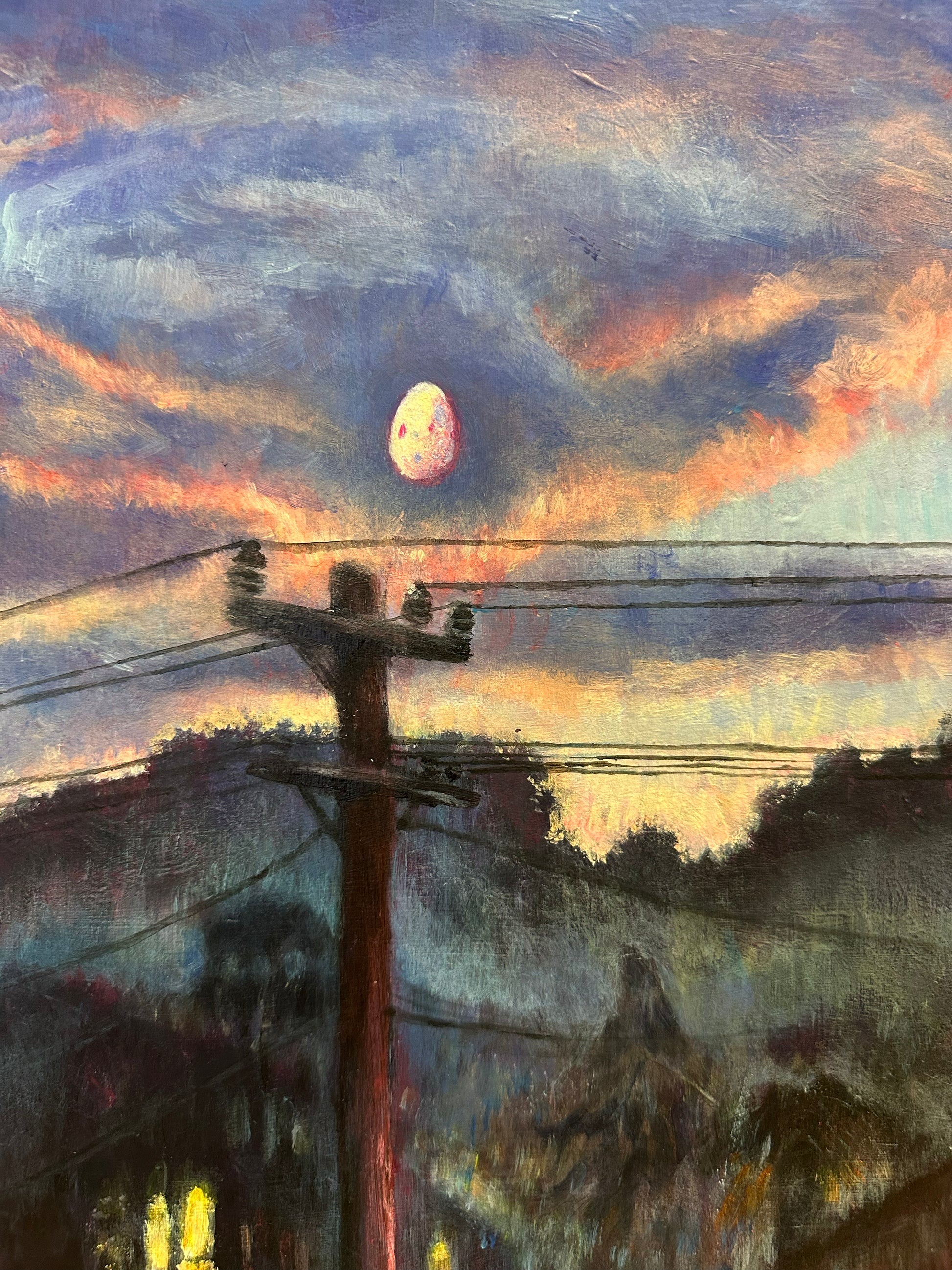 Each work is part of a quiet system — one made from dream fragments, streetlight rituals, astrology, demonology, and loose-worldbuilding drawn from everyday observation. Coordinates are found using tools like randonautica or satellite maps, like divination. Landscapes and figures emerge through memory, fear, impulse, and a kind of generated mythology that feels both personal and uncanny.