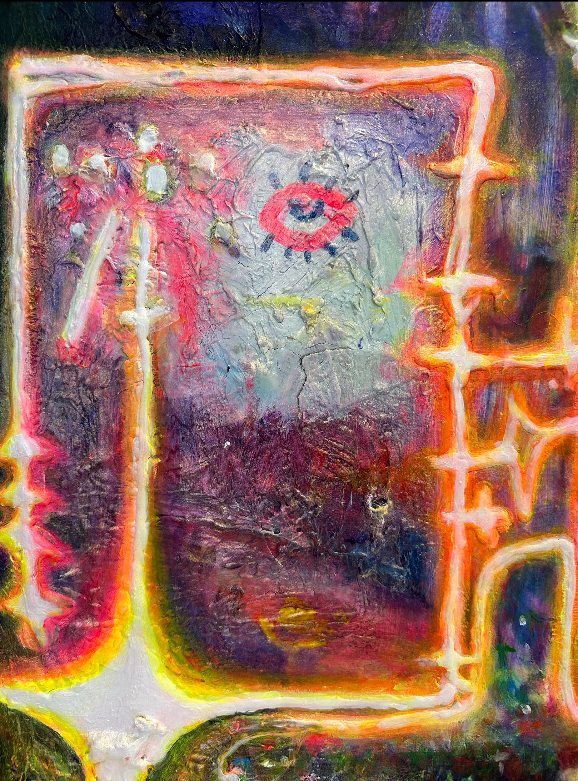 Each work is part of a quiet system — one made from dream fragments, streetlight rituals, astrology, demonology, and loose-worldbuilding drawn from everyday observation. Coordinates are found using tools like randonautica or satellite maps, like divination. Landscapes and figures emerge through memory, fear, impulse, and a kind of generated mythology that feels both personal and uncanny.