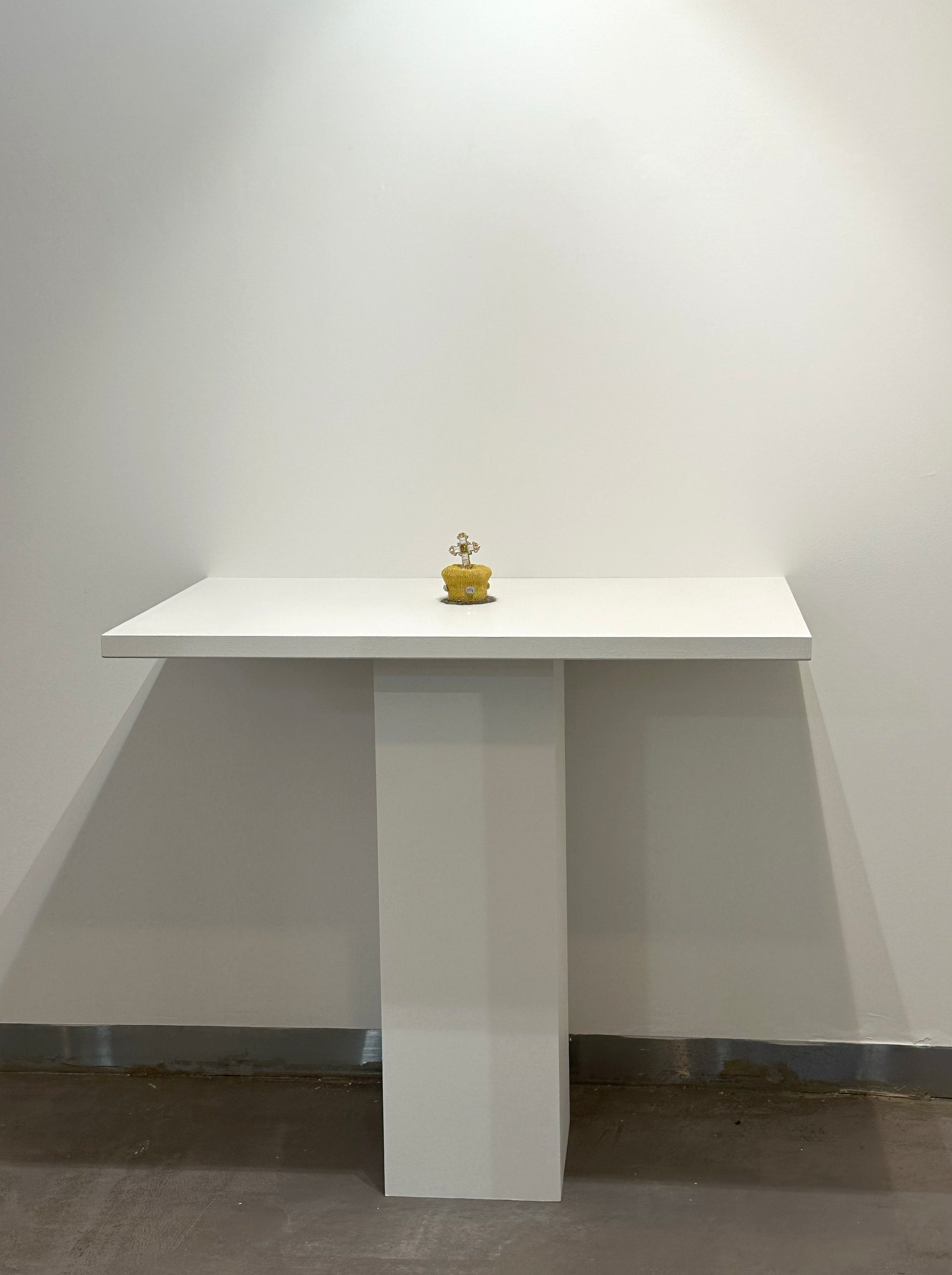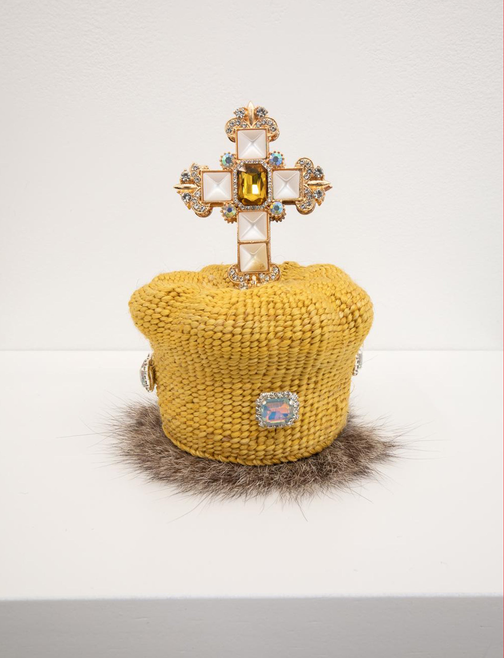 The body of the crown sits on a bed of possum fur and atop of the crown is a metal cross embellished with rhinestones. The distinctly oppositional symbolism of both emphasises the fact that the struggle for Māori to inhabit positions of power equal to those of tangata tiriti is never-ending. crown under references the colonisers of both Aotearoa and Australia, and the rightful place that the colonial rule belongs, under and abolished.