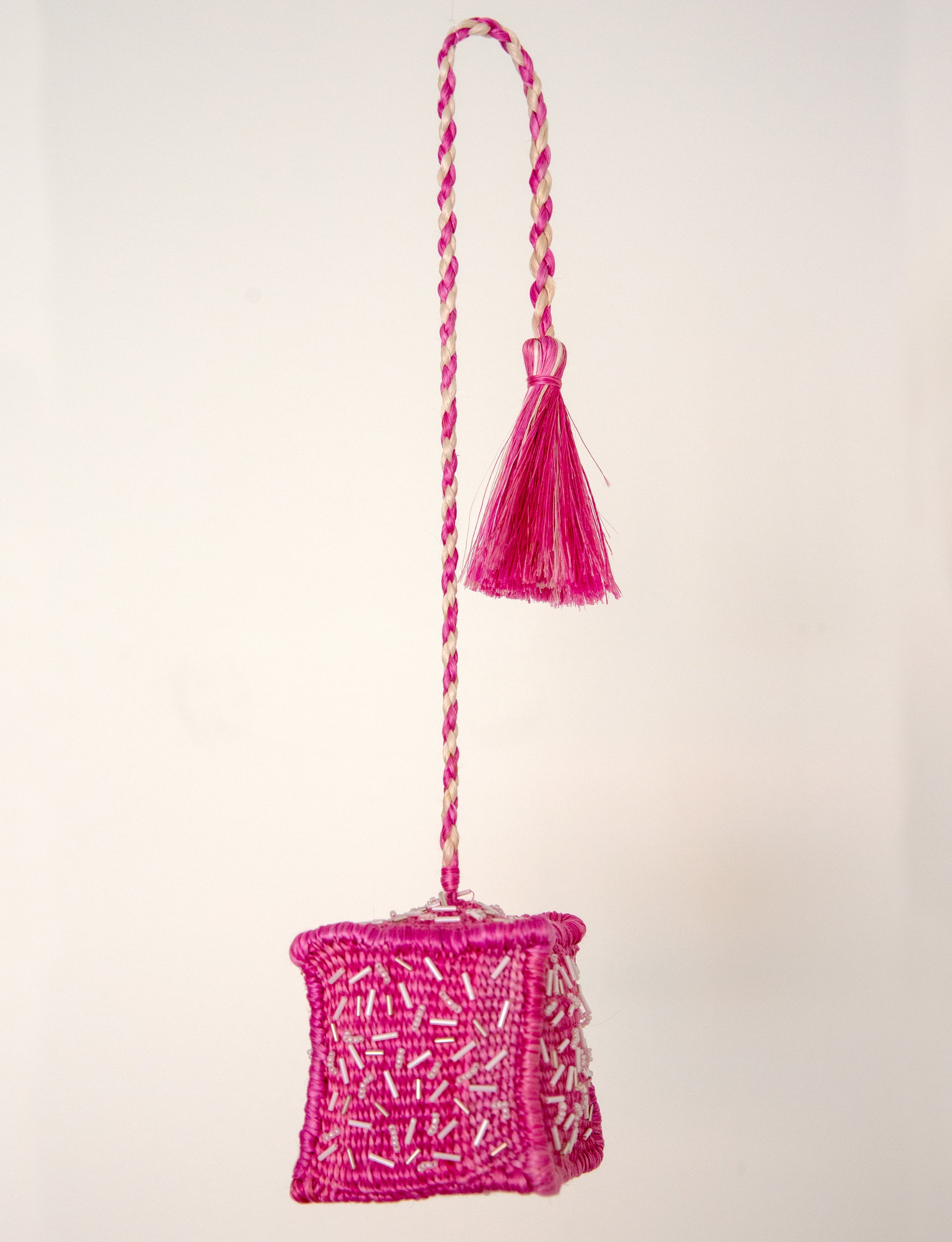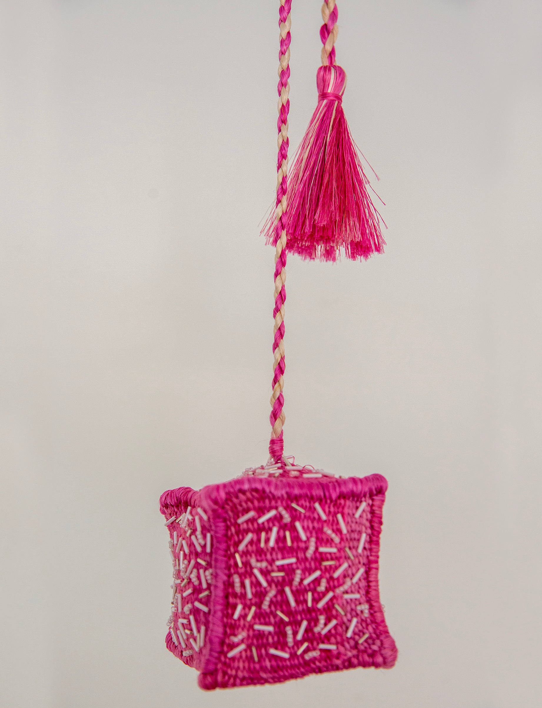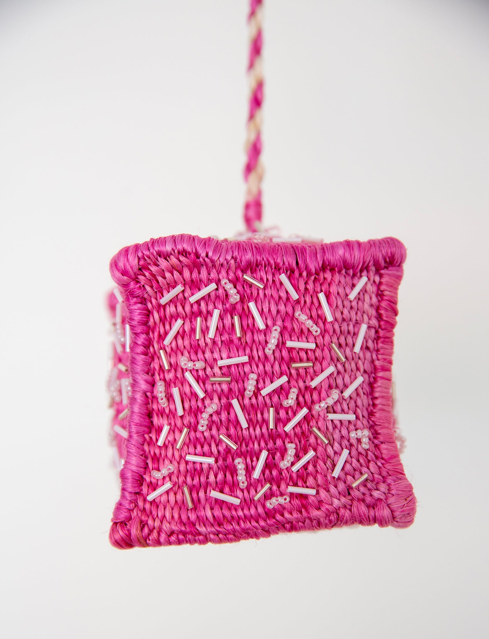 cake of origin is a pink square lamington poi, crafted with dyed pink muka and glass beads.