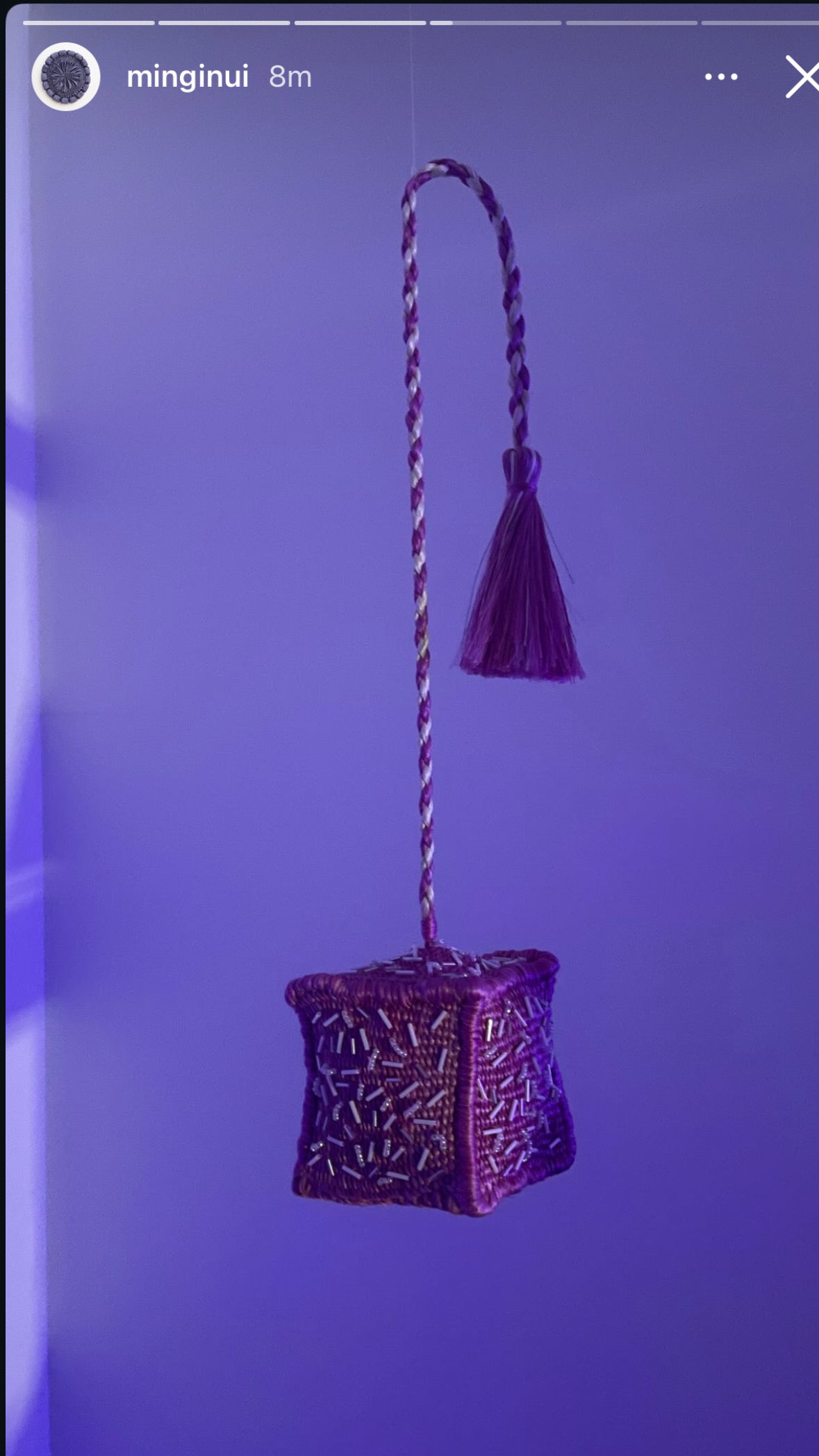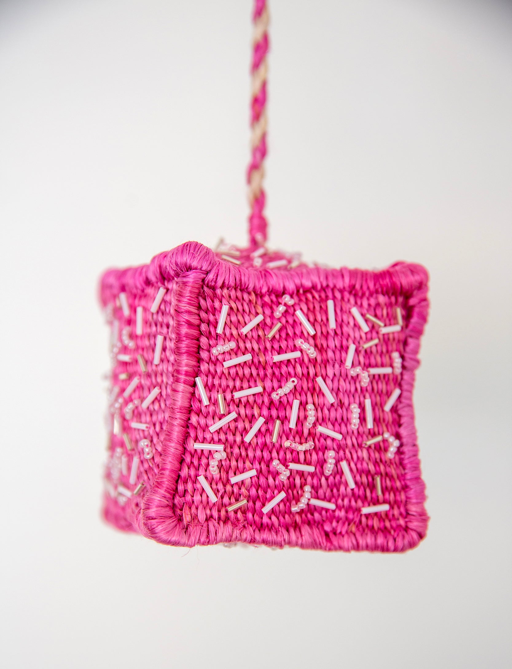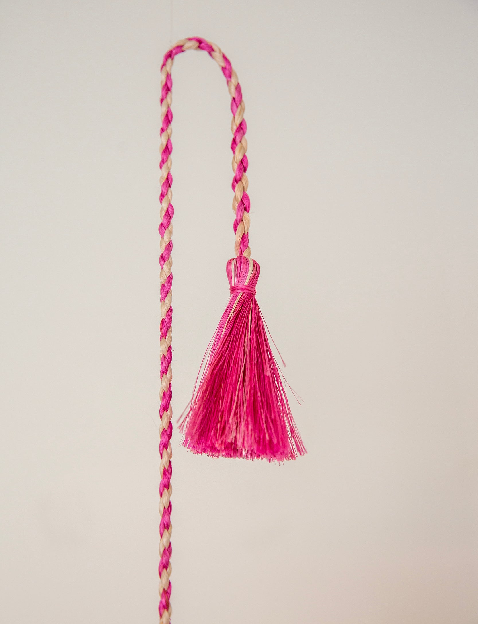 cake of origin is a pink square lamington poi, crafted with dyed pink muka and glass beads.