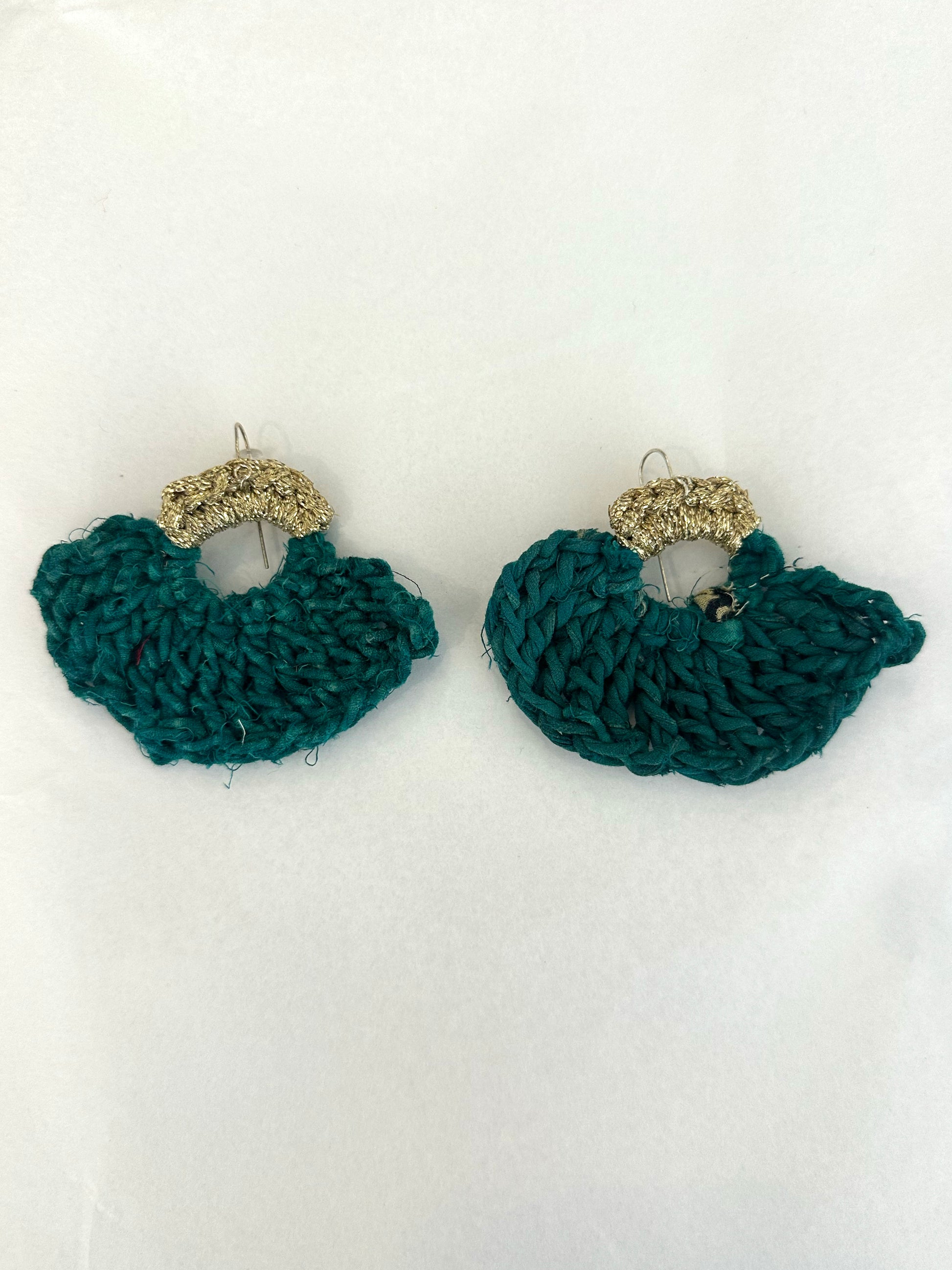 One of a kind crochet earrings made from fair trade recycled cotton sari twine and good lamé thread with sterling silver hooks