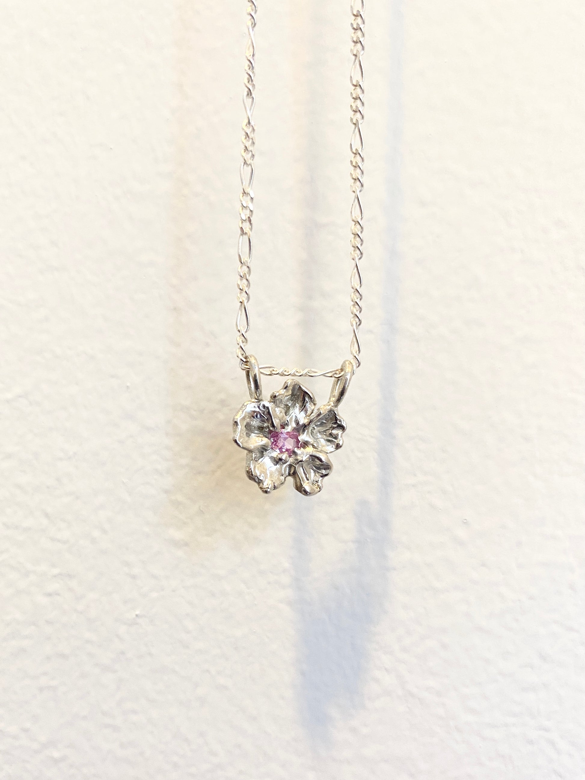 Custom flower necklace by LRM jewellery, made exclusively for Treasure shop. Sterling silver with lab grown sapphire.